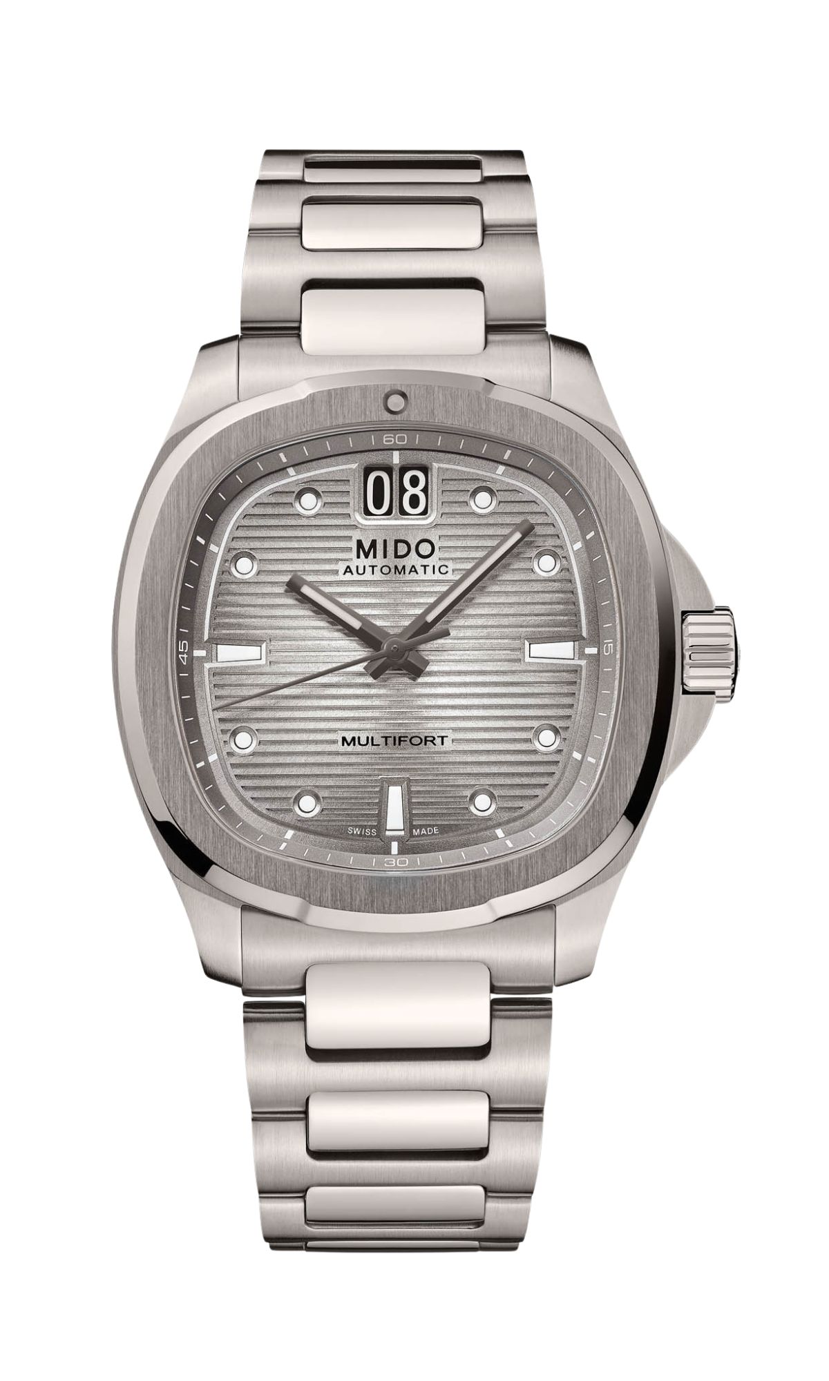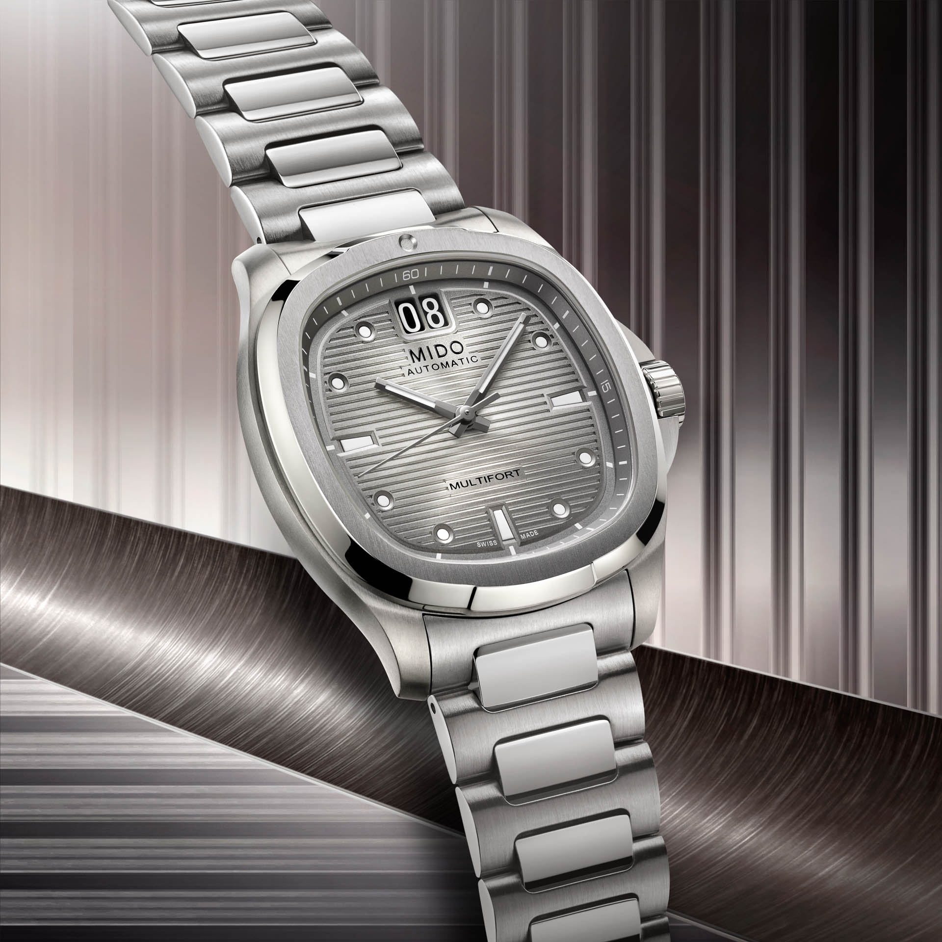 ¡Un brillante regreso! Nacido de la extraordinaria herencia de MIDO, el icónico diseño con caja en forma de TV vuelve a ocupar el centro del escenario con el Multifort TV Big Date, tan intenso como preciso gracias a su formidable movimiento mecánico.