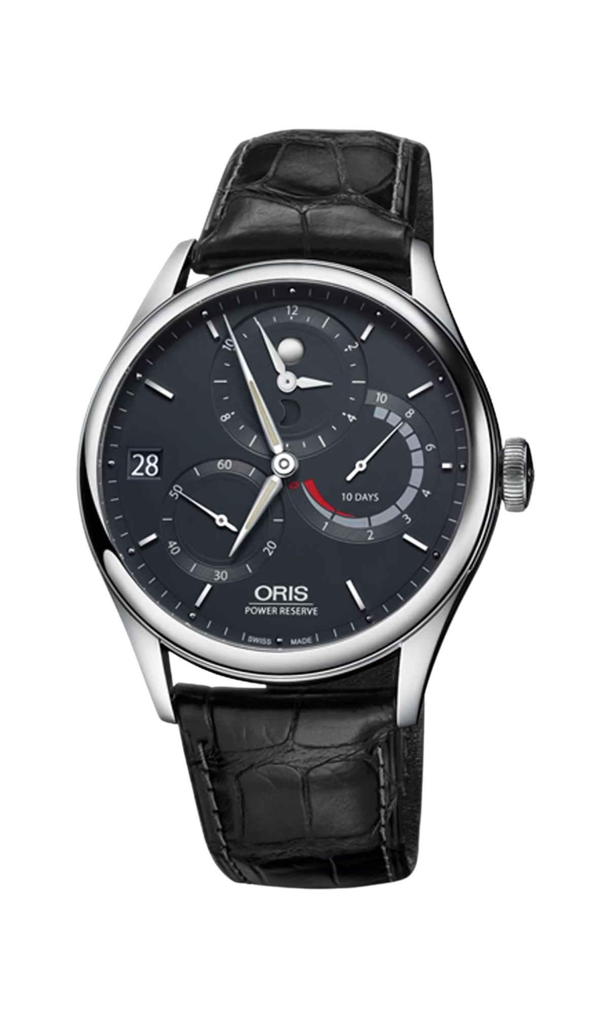 | Funciones | Agujas centrales para horas y minutos (T1), segundero subsidiario a las 7.30 h. Esfera subsidiaria con horas y minutos (T2) a las 12 h con indicador incluido de día y noche. Indicador no lineal de reserva de marcha a las 3 h, ventanilla fecha, corrector de fecha, ajuste sincronizador de precisión y paro segundo. |
