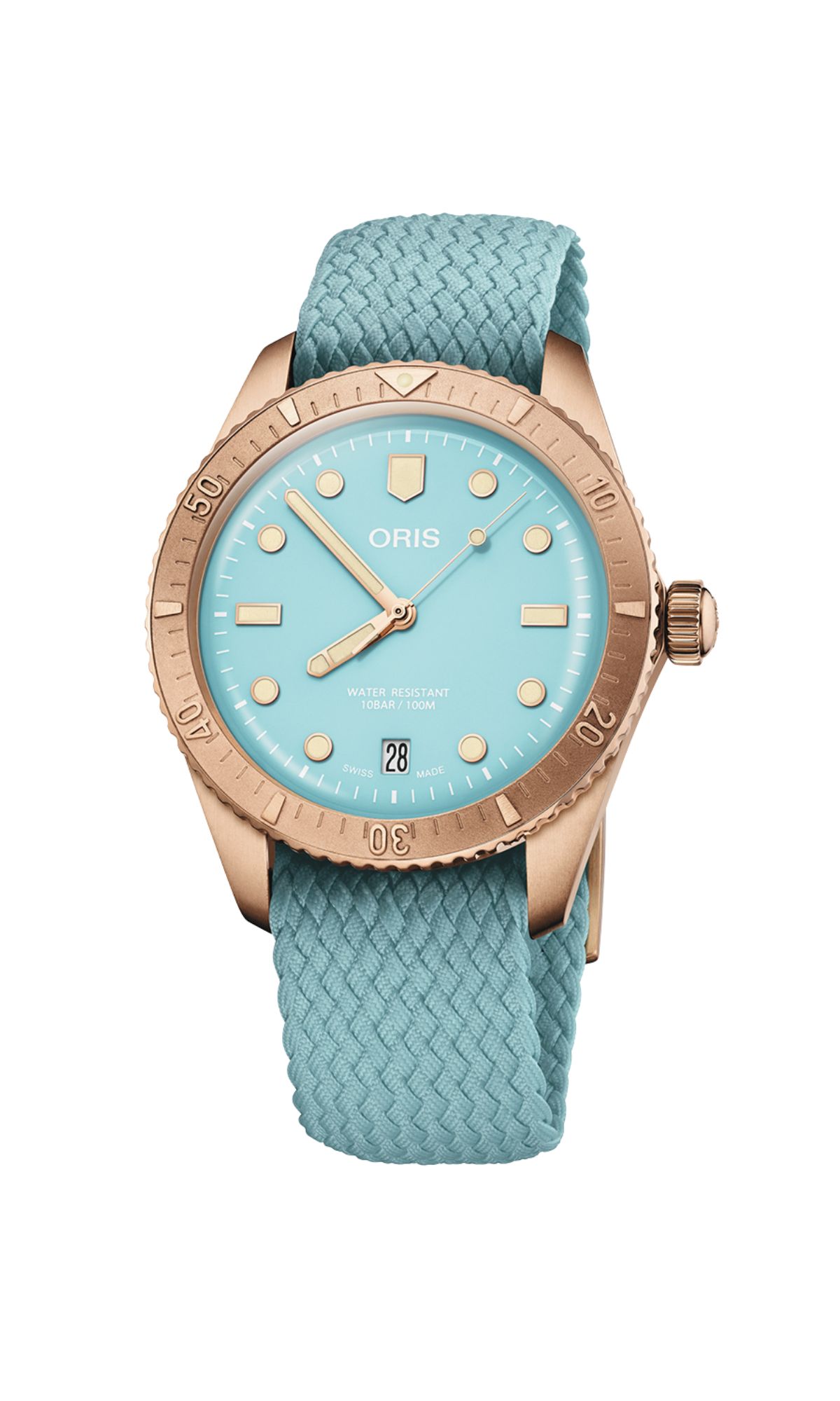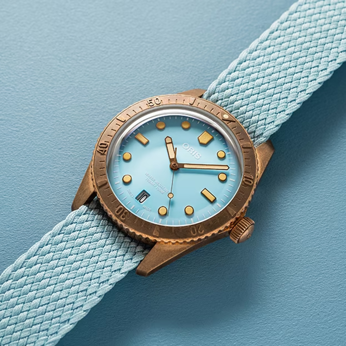 El Divers Cotton Candy, un icono de Oris desde 1965, ahora en bronce con una destacada esfera azul. Este diseño intemporal incluye una sólida caja de bronce. Una pieza icónica de la relojería suiza.