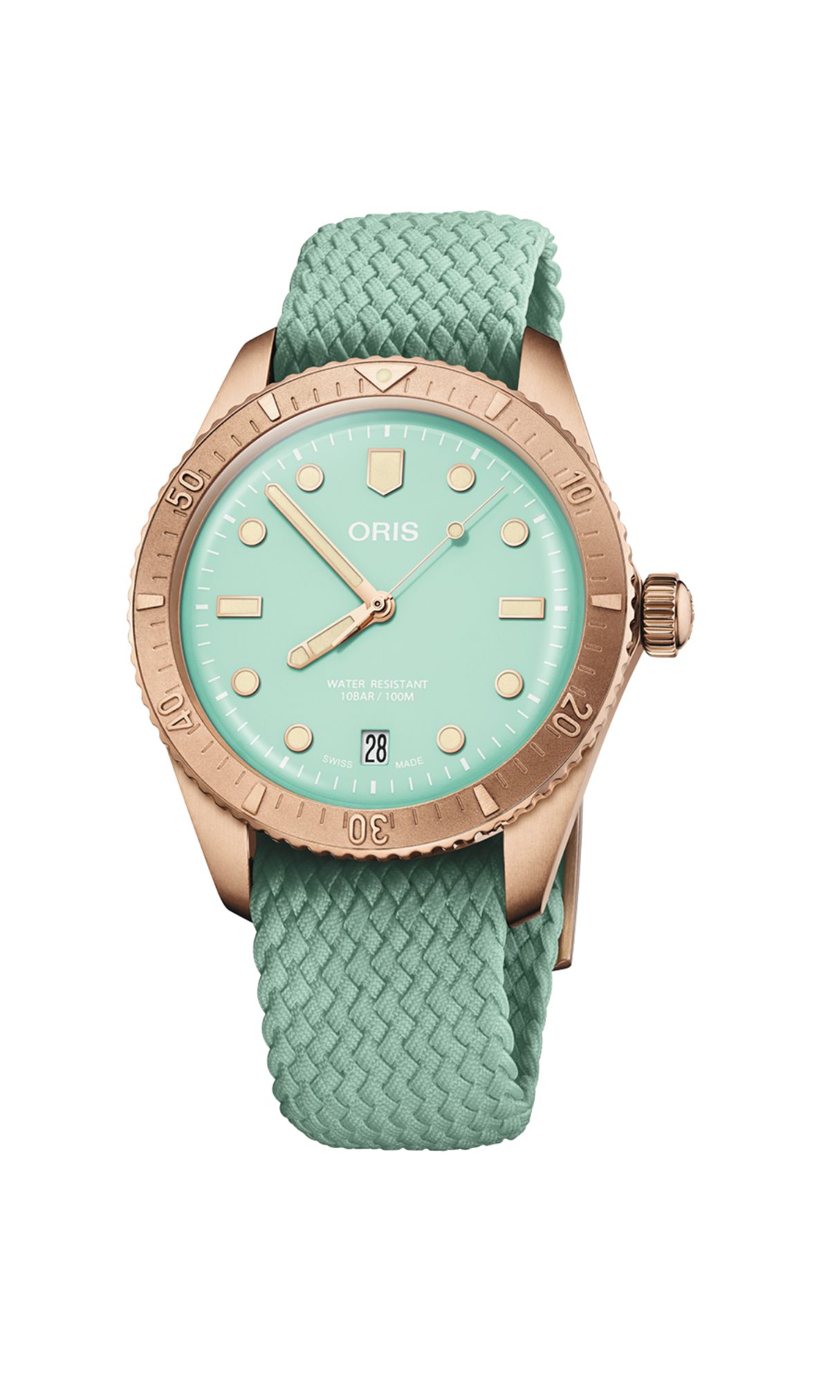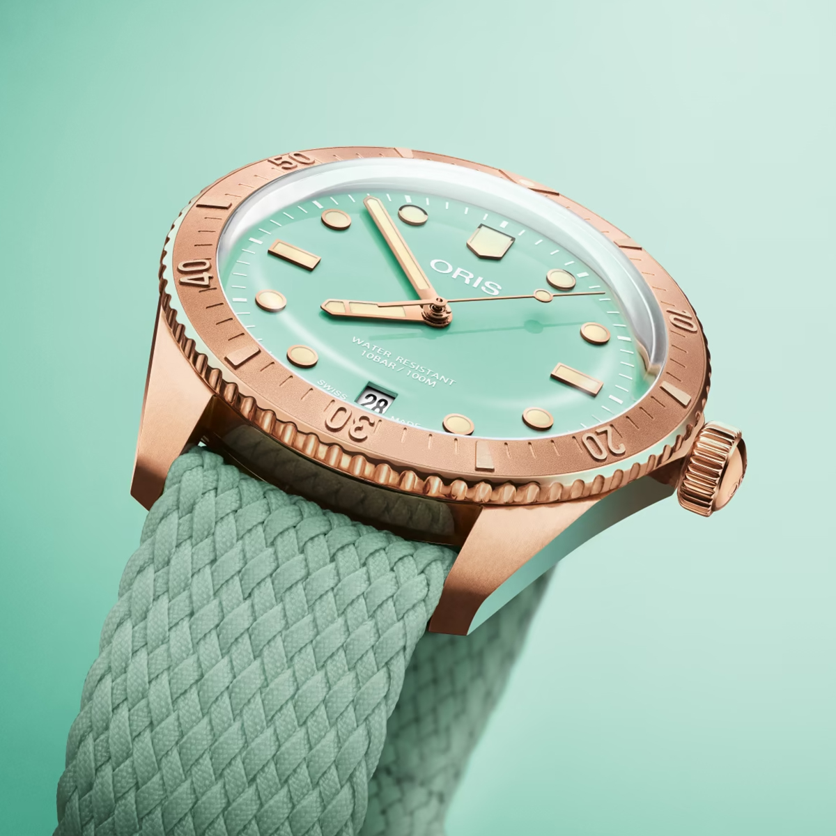 El Divers Cotton Candy, un icono de Oris desde 1965, ahora en bronce con una destacada esfera azul. Este diseño intemporal incluye una sólida caja de bronce. Una pieza icónica de la relojería suiza.
