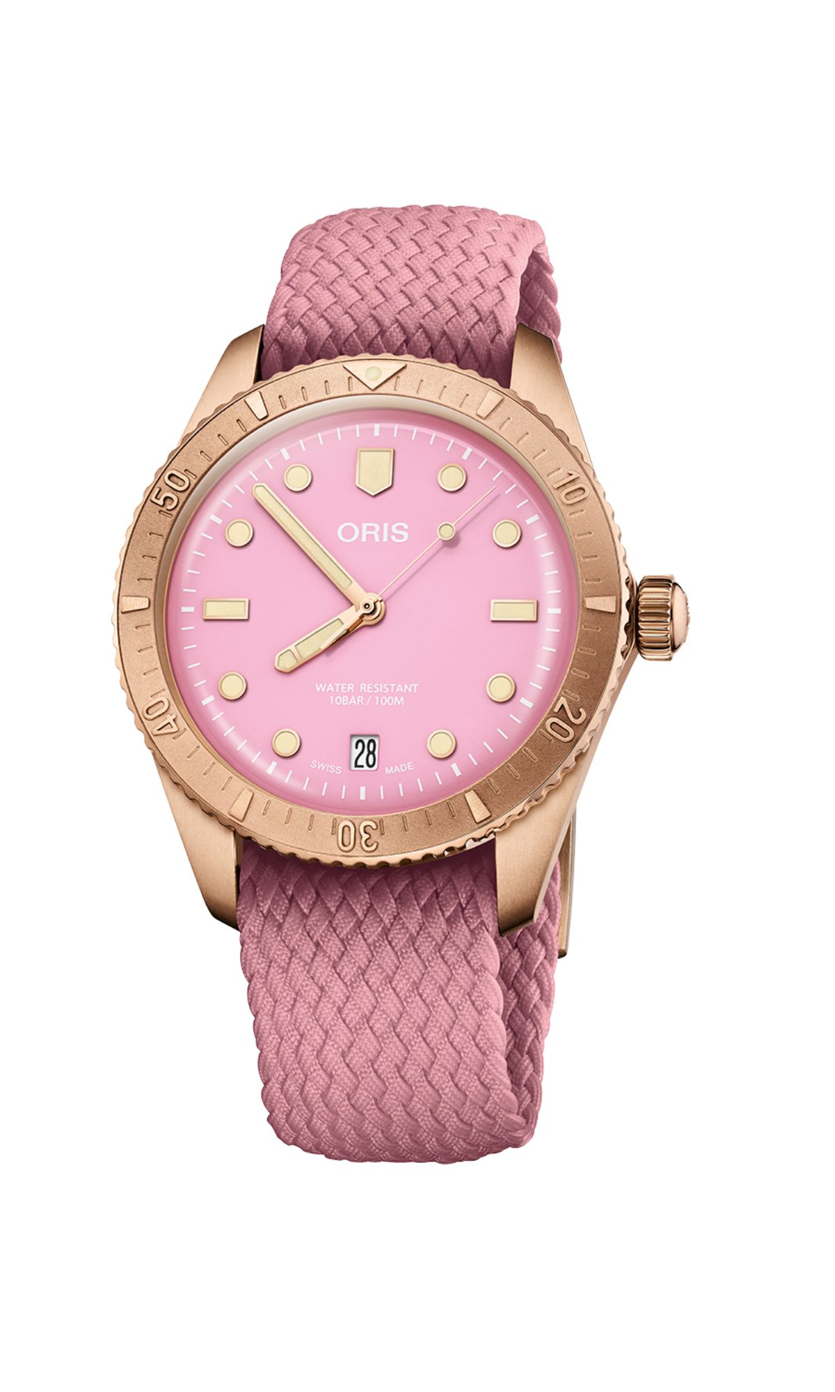 El Divers Cotton Candy, un icono de Oris desde 1965, ahora en bronce con una destacada esfera en color rosa. Este diseño intemporal incluye una sólida caja de bronce. Una pieza icónica de la relojería suiza.