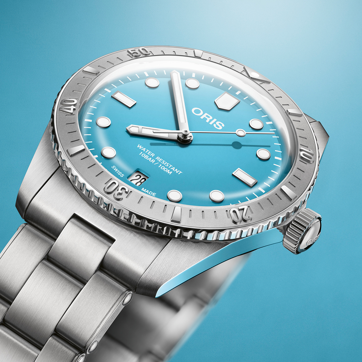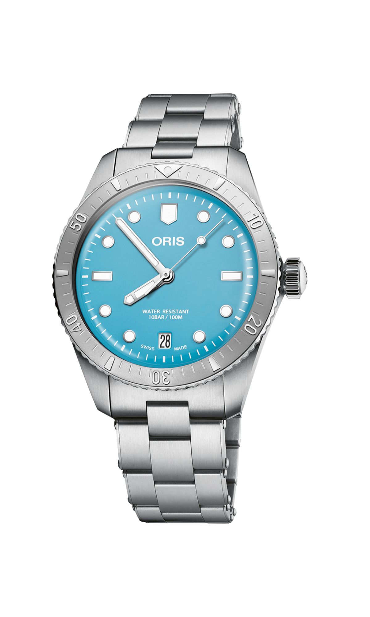 El Divers Cotton Candy, un icono de Oris desde 1965, ahora en bronce con una destacada esfera azul. Una pieza icónica de la relojería suiza.